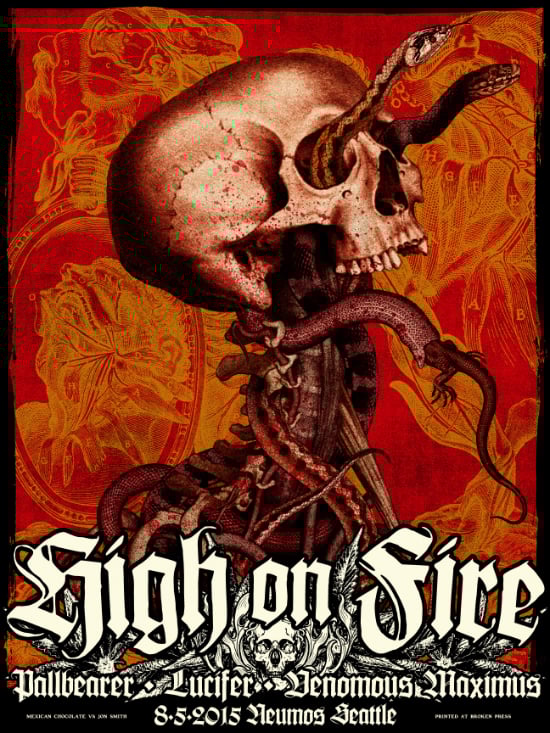 Here stands an 18" x 24" three color screen print for High on Fire at Neumos in Seattle, WA.